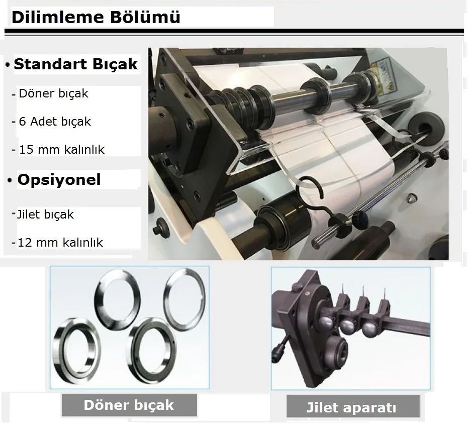 Bu makine, yapışkanlı kağıt, termal kağıt, alüminyum folyo, film, etiket ve diğer malzemeleri dilimlemek için uygundur.