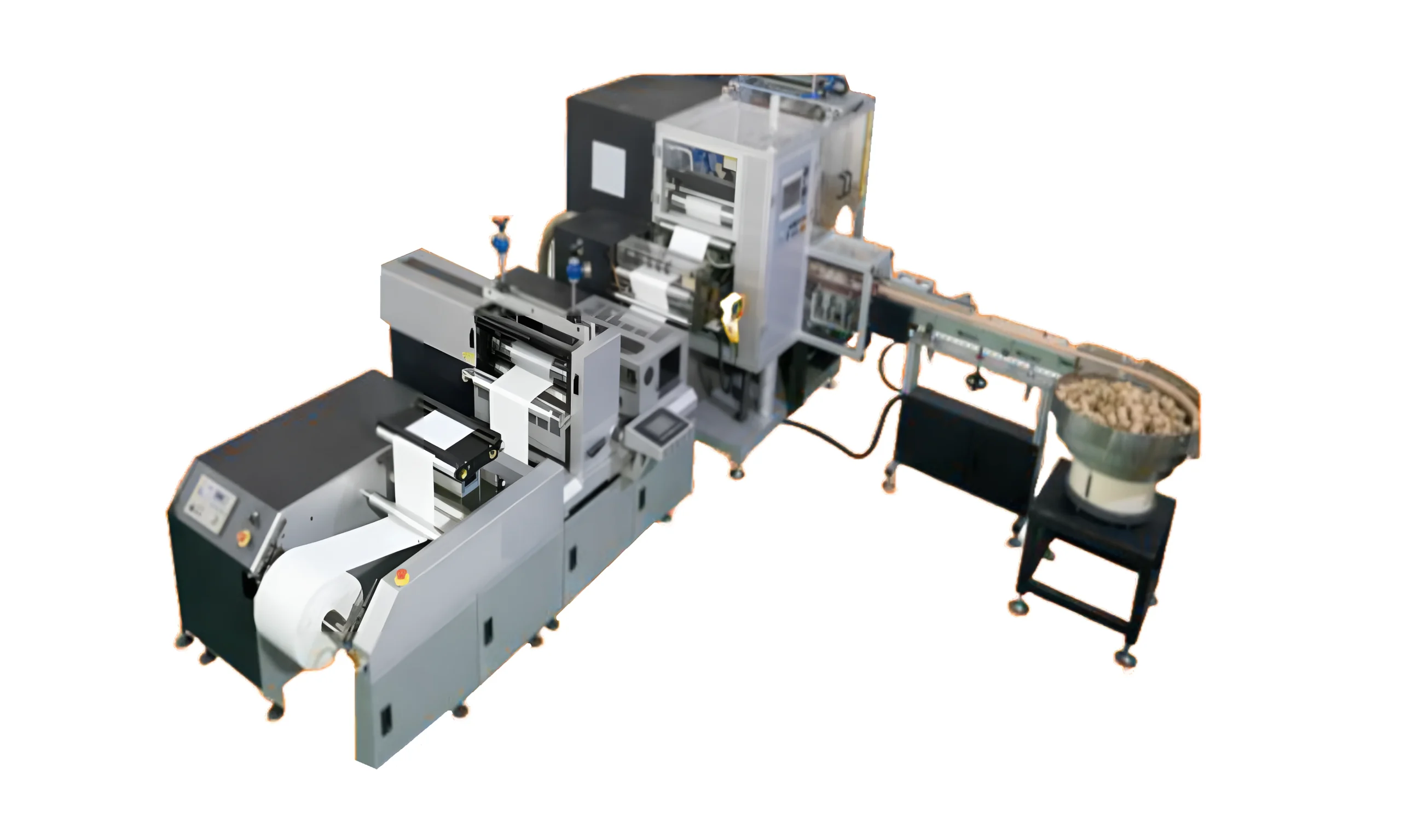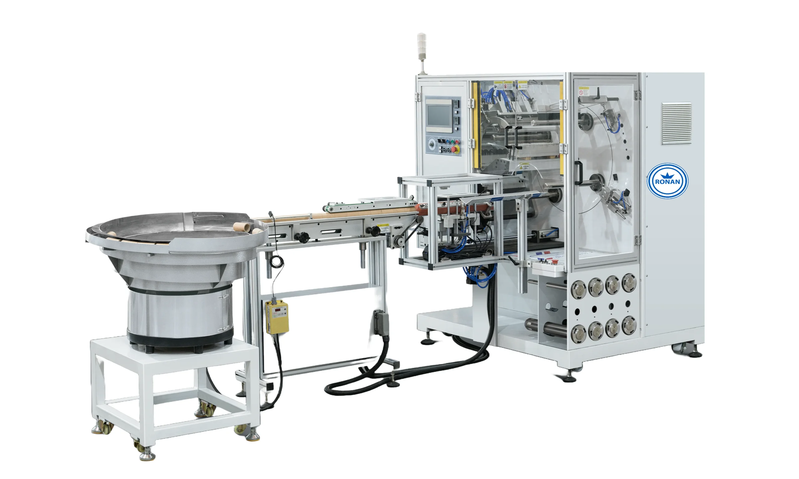Tam otomatik etiket işleme makinesi, yarım kesim, dilimleme , ayıklama, sarım, etiket sonu kapatma, kuka besleme, gruplama ve shrink paketlemeye kadar tüm işi tek bir hatta kesintisiz olarak yapabilen bir makinadır. Turret sarıcı, 1 inç, 1,5 inç, 3 inç hızlı sökülen havalı mil ile çalışmaktadır. Makine, akıllı üretim elde etmek ve işçilik maliyetini azaltmak için farklı mil boyutları değiştirildiğinde otomatik olarak ayarlarını yapabilir.